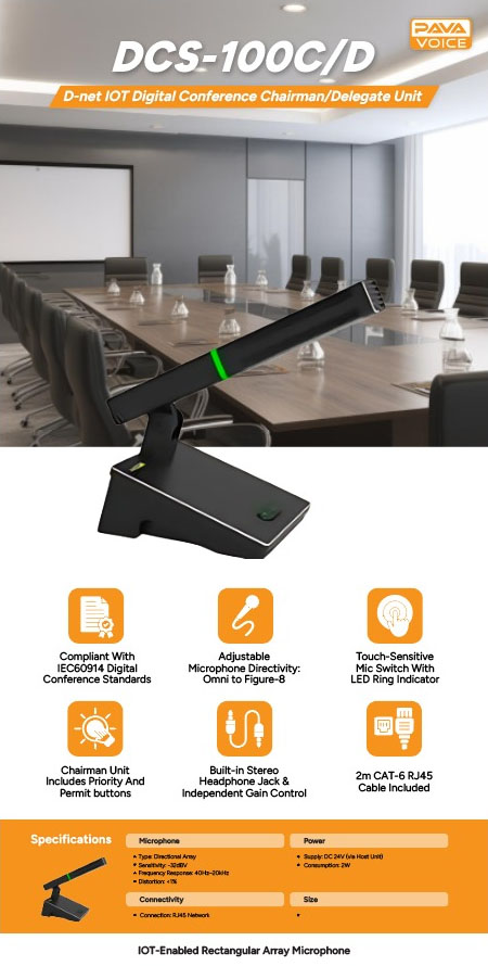 Create a more efficient and professional conference environment with the PAVAVOICE DCS-100C / DCS-100D tabletop conference microphone system. Whether you are upgrading a boardroom, planning a government meeting room, or building a complete conference system in Malaysia, this series offers the clarity, control, and usability needed for modern discussions.